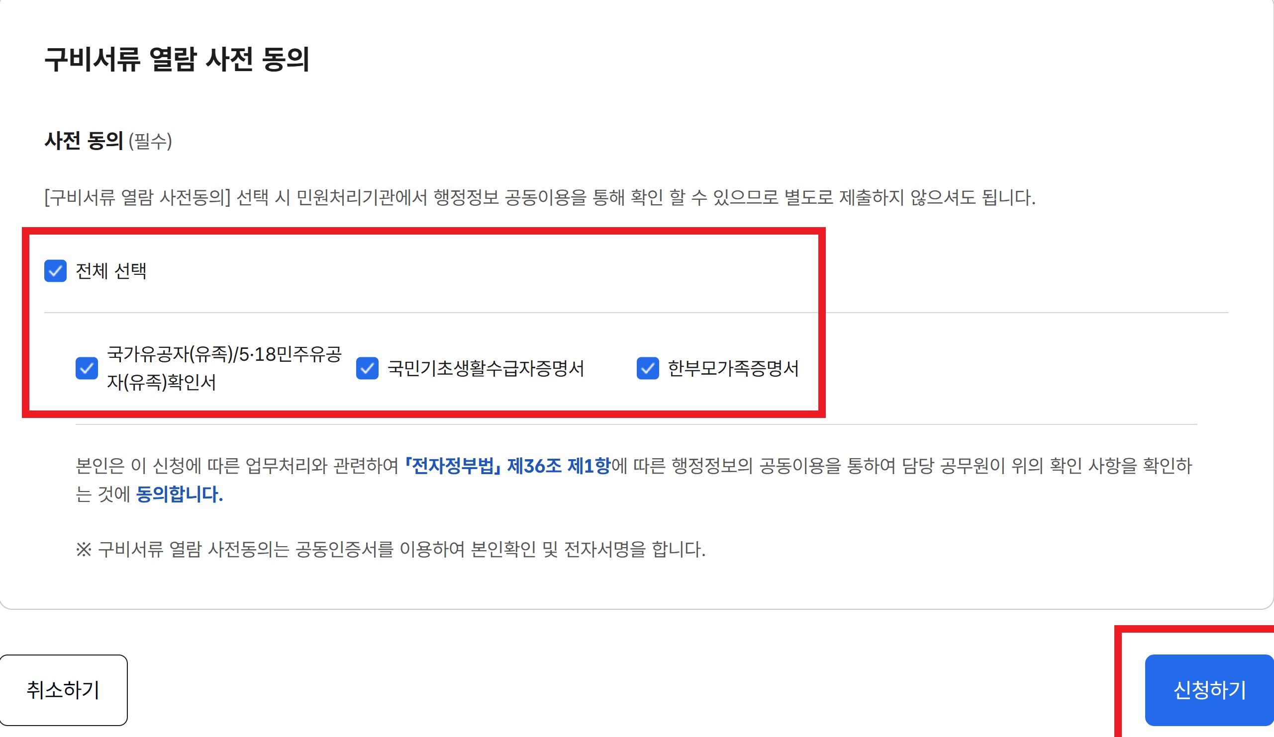 제출 생략 가능한 서류(행정정보공동이용 동의 시)