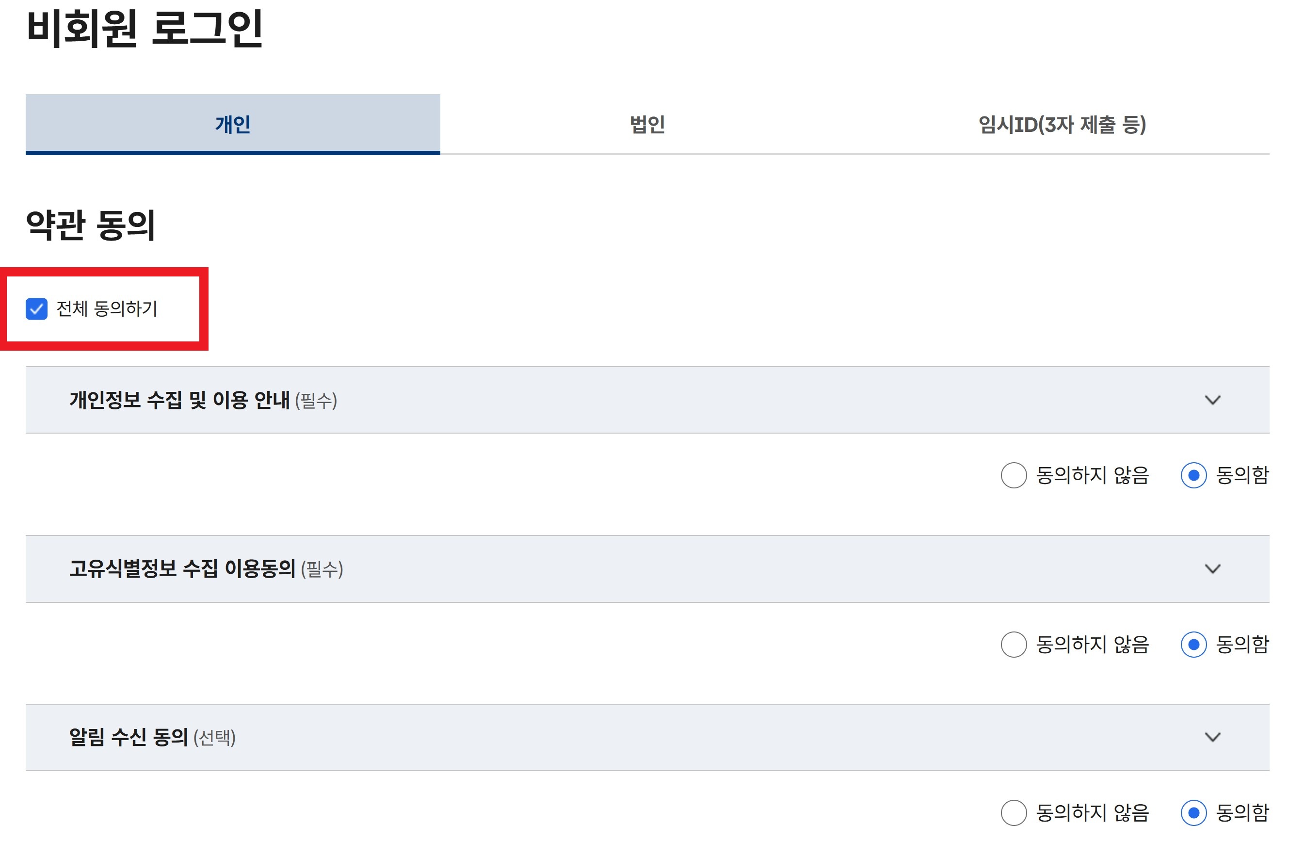 위의 전체 동의하기를 체크해 주시면 되겠습니다.