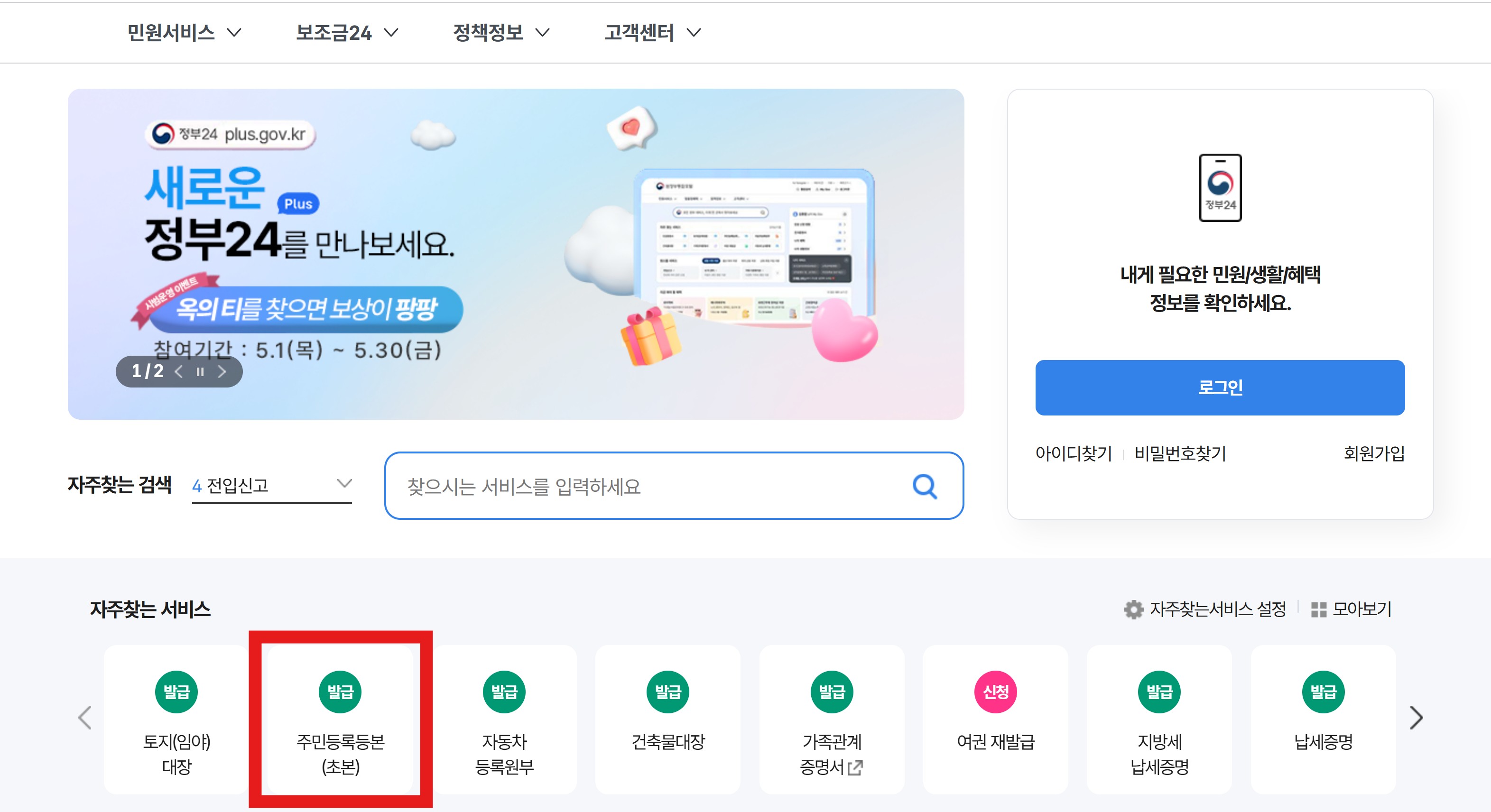 위 이미지처럼 자주 찾는 검색 및 자주 찾는 서비스에 주민등록등본을 클릭해 들어가는 방법 또는 직접검색을 해서 들어가는 방법이 있으니 편하실 대로 접속하시면 되겠습니다.