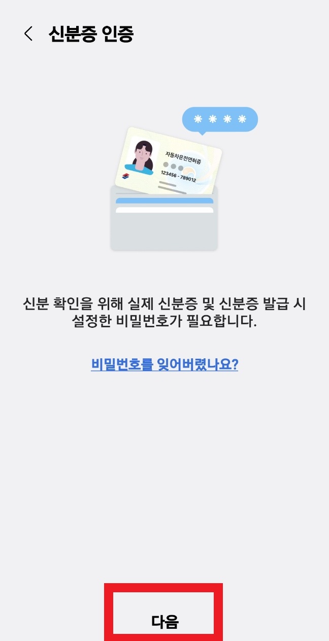- 휴대폰 후면 중앙에 운전면허증을 대고 NFC로 인식