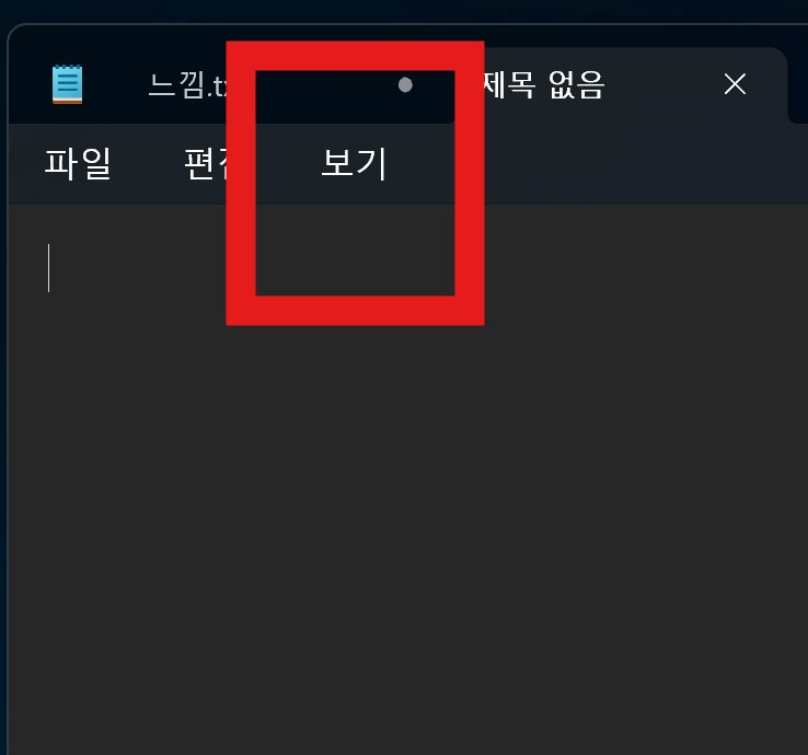 메모장이 실행되면 상단 메뉴에 있는 ‘보기’ 탭(View) 을 클릭합니다. 혹시 상단 메뉴가 보이지 않는다면, Alt 키를 눌러 메뉴를 표시해 주세요.