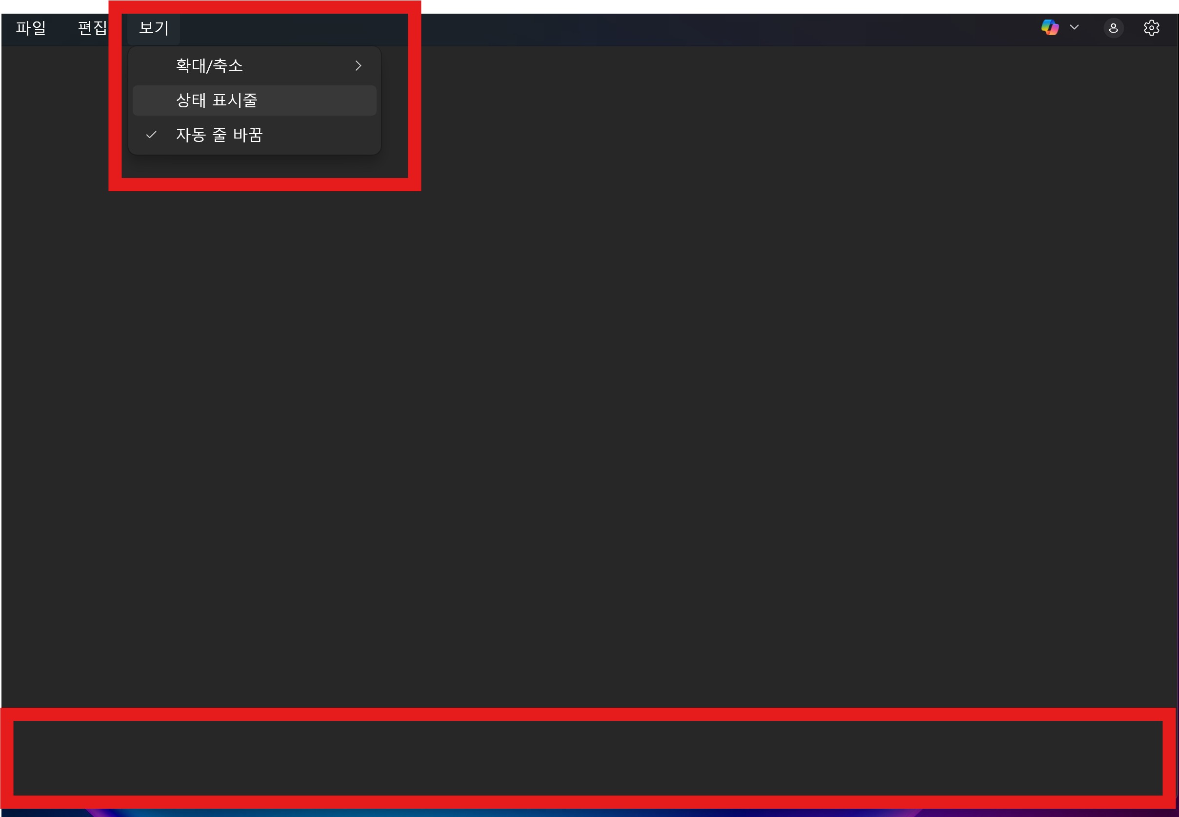 이 기능은 메모장이 최대화되지 않았을 때만 보이는 경우가 있습니다. 창을 너무 작게 해놓았거나 전체 화면 모드에 있으면 표시줄이 안 보일 수도 있습니다.