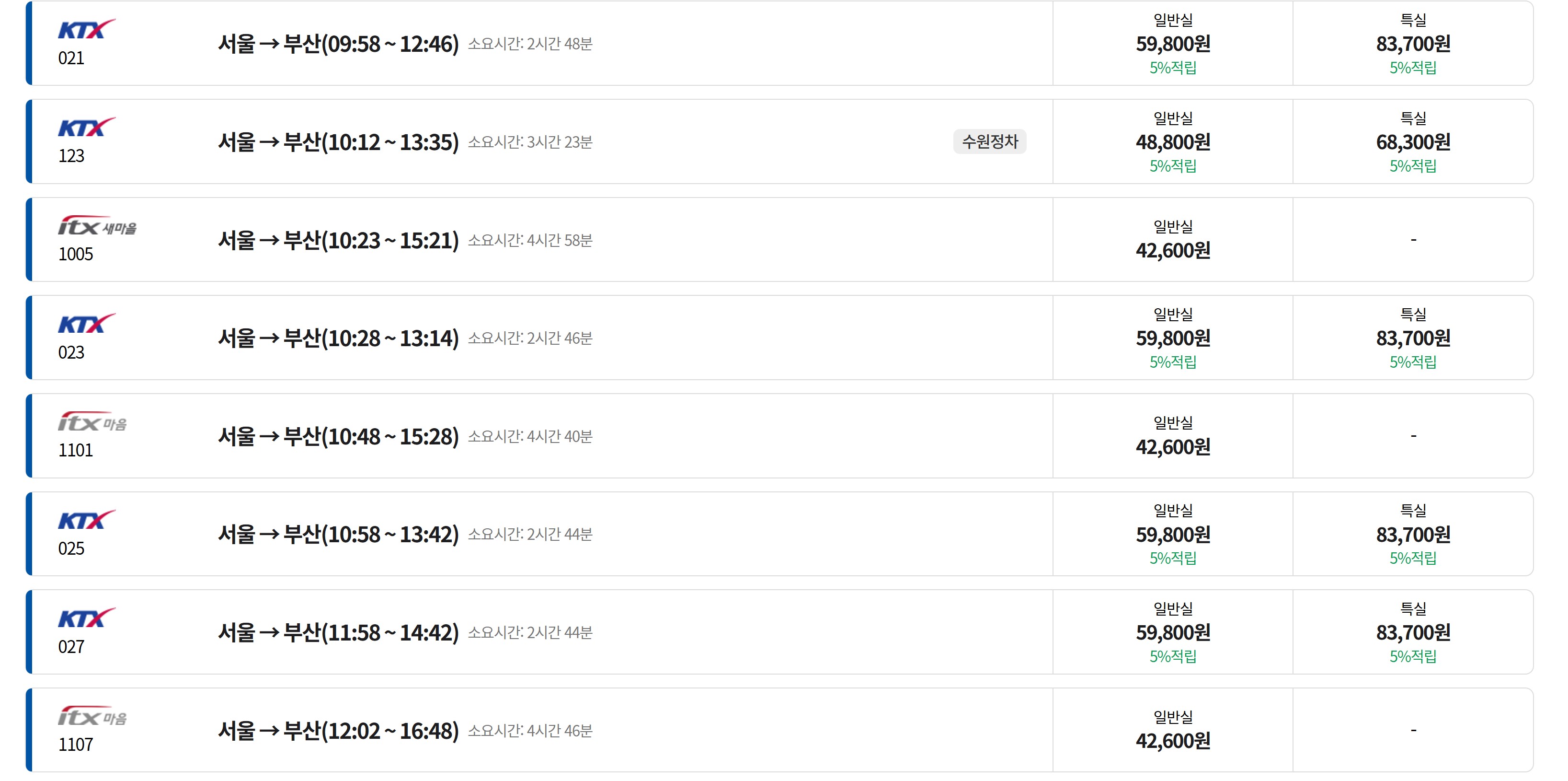조회된 결과에서 다양한 KTX 및 ITX 열차들이 표시됩니다.