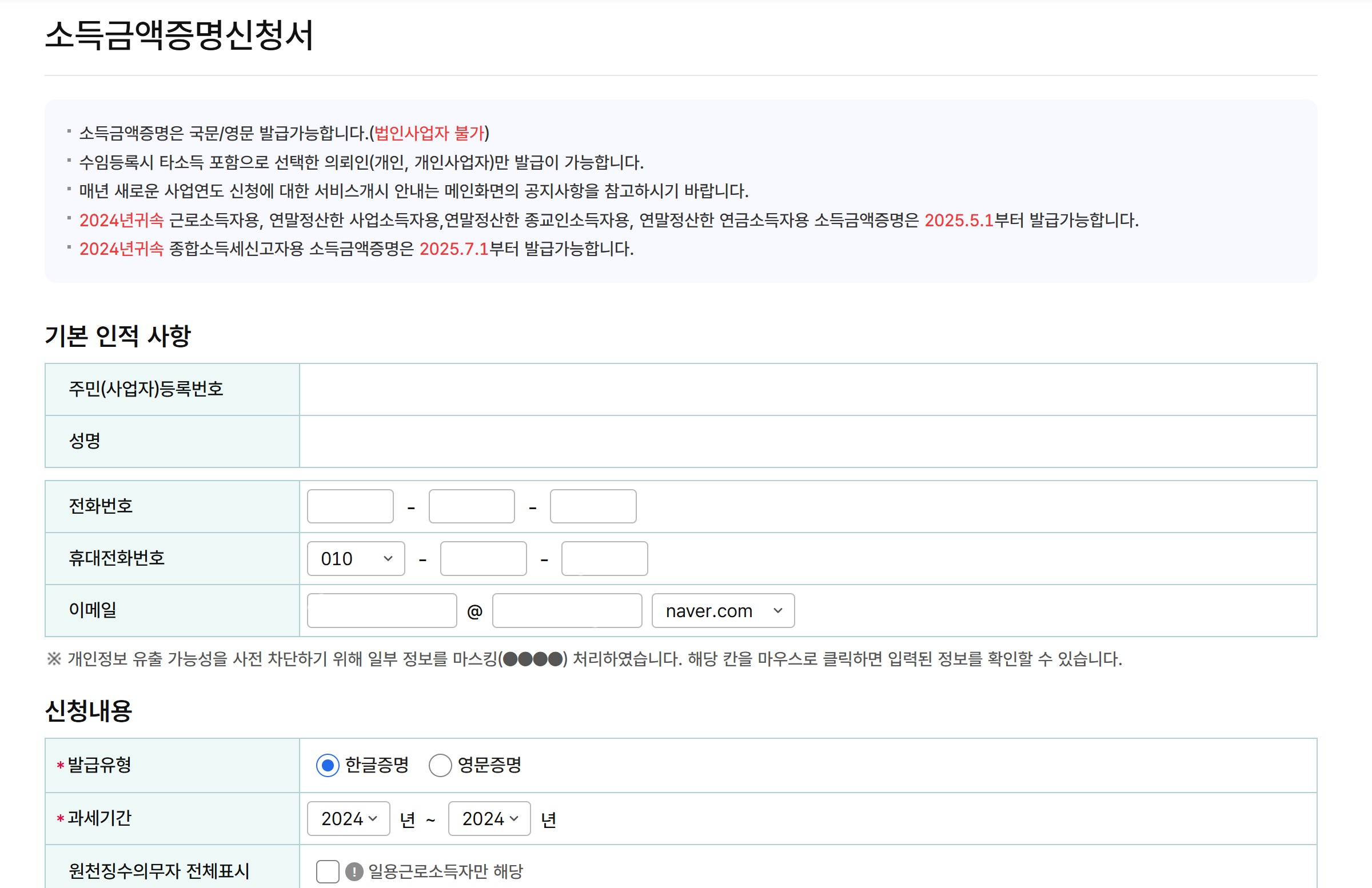 - 단, 민감한 서류(소득금액증명원 포함)는 비회원 발급 불가