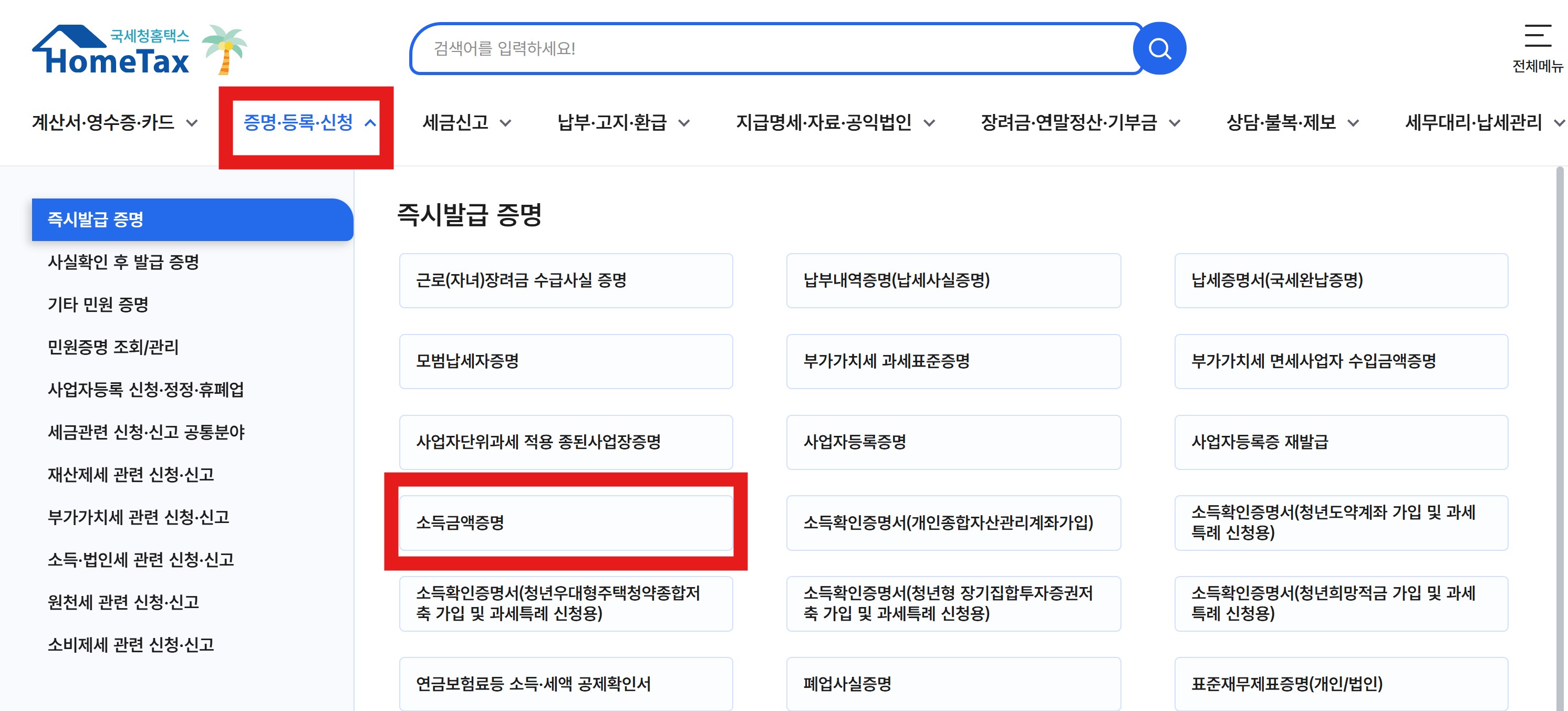 - 상단 메뉴 [증명 등록 신청] → [소득금액증명]